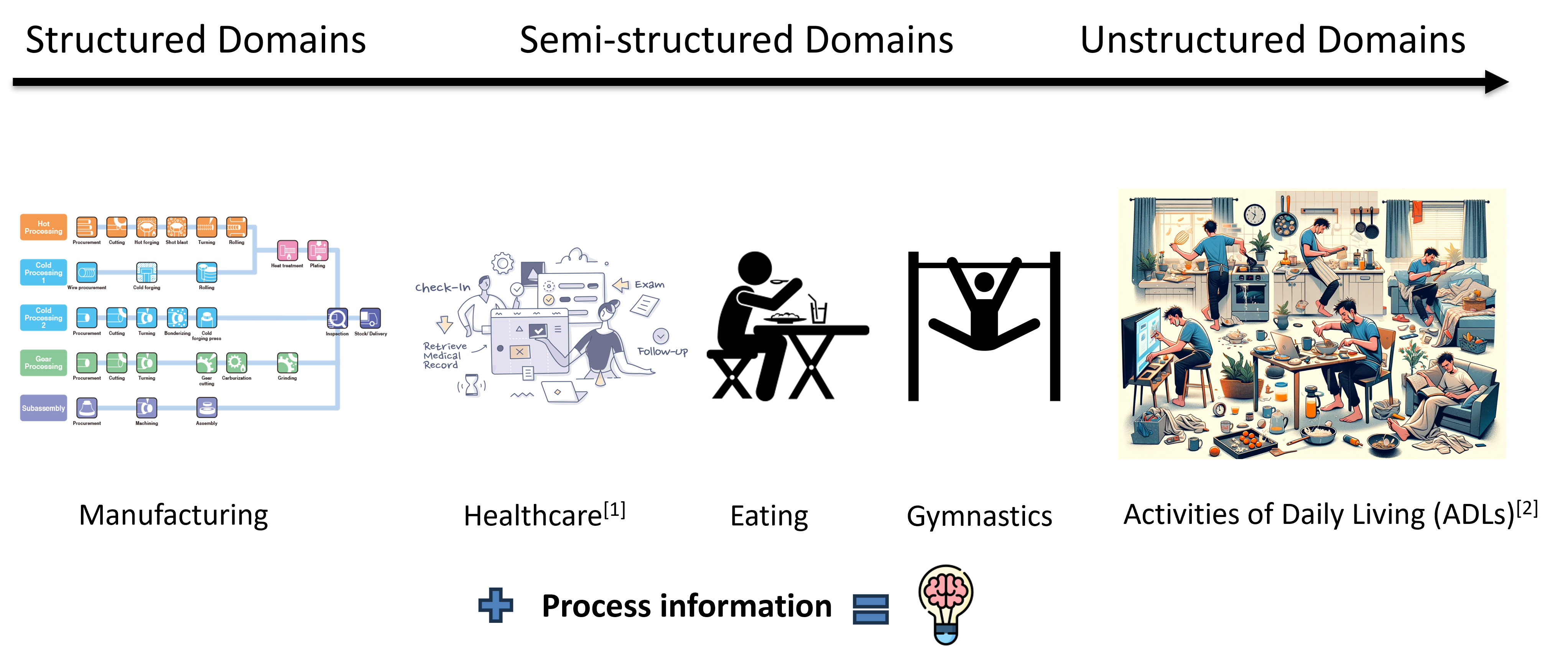 Varying structures of processes in different domains complicate the task of capturing and analysing these patterns, as well as understanding the multifaceted nature of anomalies. Some domains are structured, like manufacturing, therefore it is easier to detect workflow patterns and deviations from them, but others are semi-structured or unstructured, like daily living. In the latter, even defining what an anomaly means is a challenge. Moreover, data are often filled with noise and uncertainties, which may lead to misinterpretation of normal occurrences as anomalies.